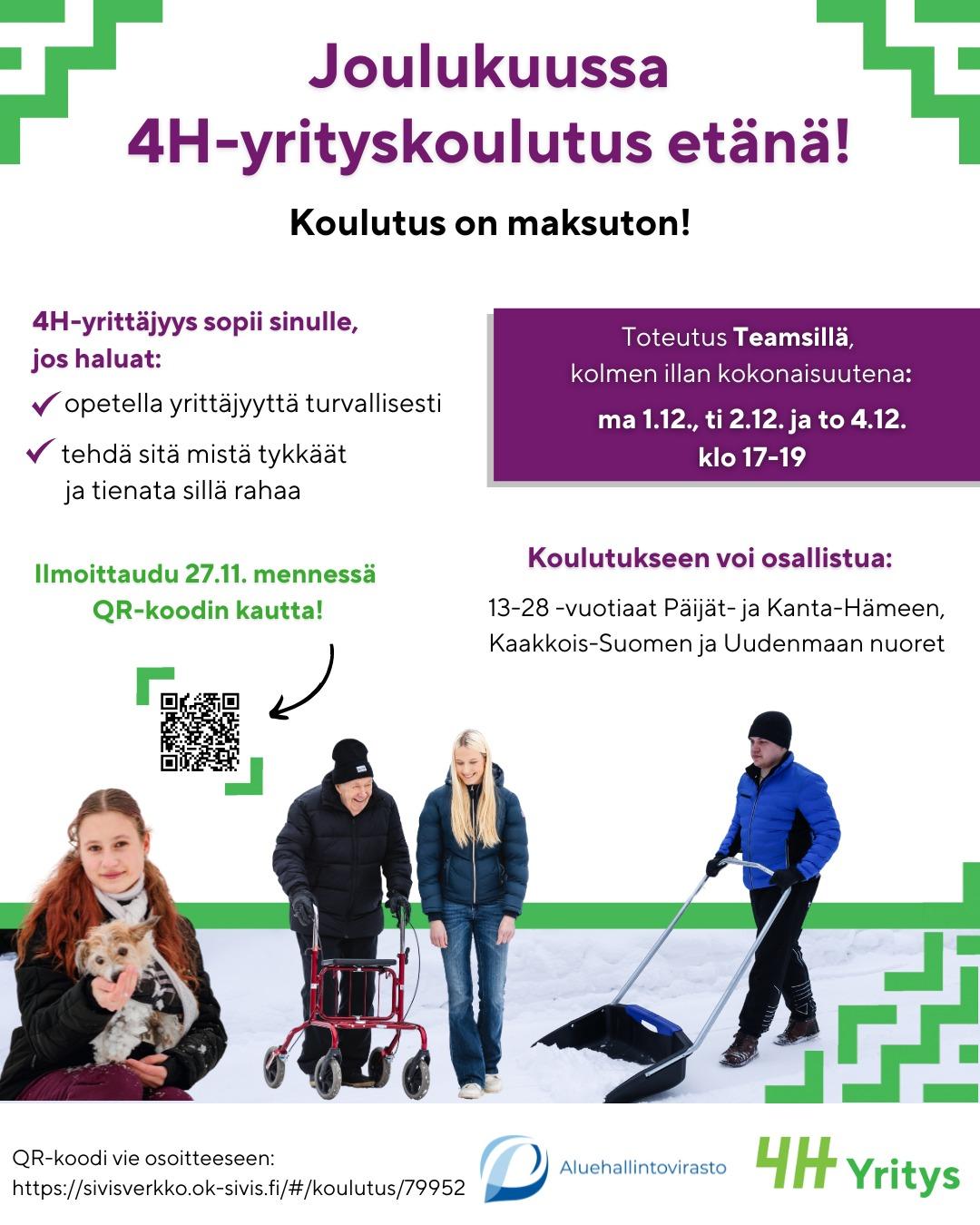 Riihimäen 4H-yhdistyksen järjestämiin koulutuksiin voivat osallistua 14-24-vuotiaat! Koulutuksilla ja kurseilla opitaan työelämätaitoja sekä perehdytään 4H-yhdistyksen työpalvelun tarjoamiin työtehtäviin. Koulutukset ja kurssit mahdollistavat työskentelyn työpalvelussa. Koulutuksiin ja kurseille voi osallistua, vaikka ei aikoisikaan toimia työpalvelussa.